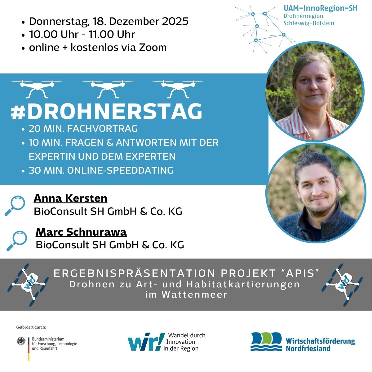 🎤 Anna Kersten und Marc Schnurawa von BioConsult SH präsentieren die wichtigsten Erkenntnisse und zeigen, wie Drohnentechnologie mit KI-Bildanalyse den Naturschutz revolutionieren kann.