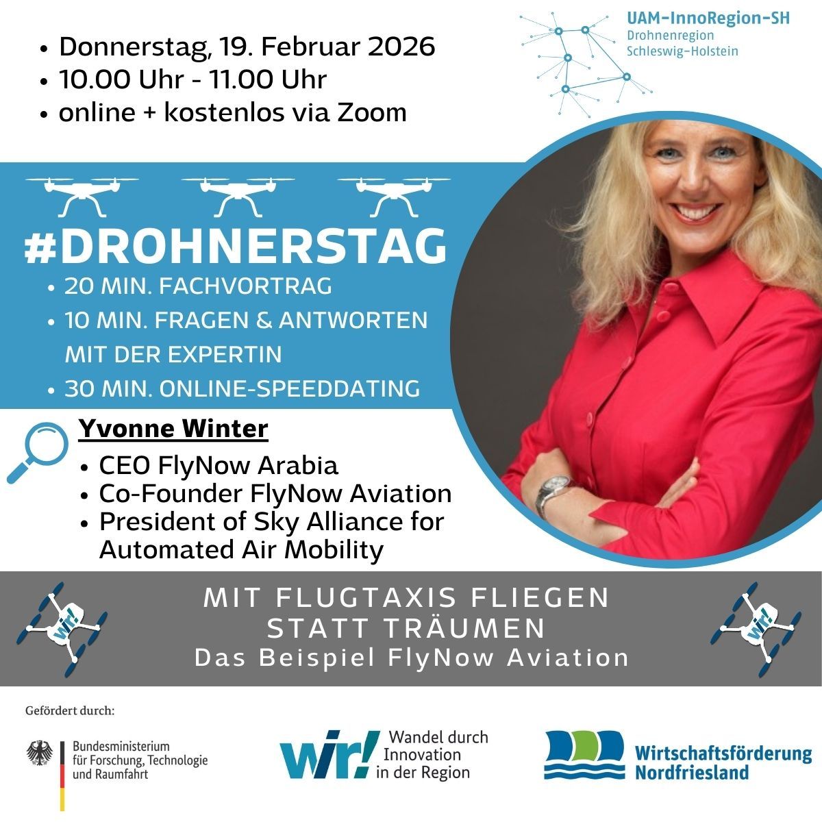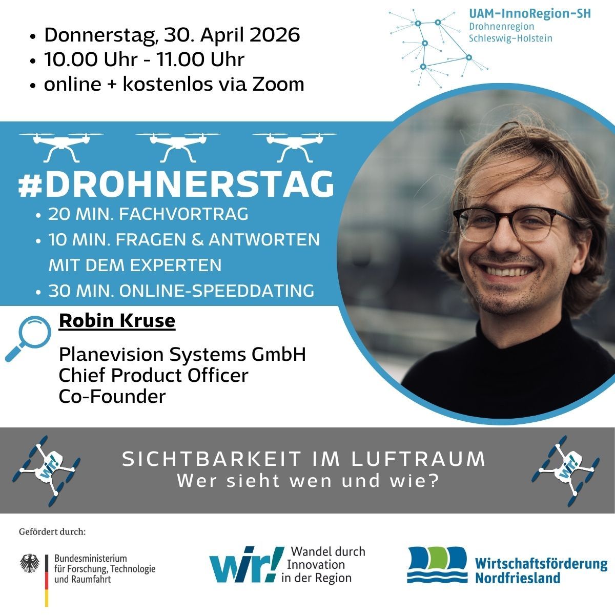 Am 15. Januar 2026 von 10:00 bis 11:00 Uhr ist es wieder so weit: Der nächste #Drohnerstag der UAM-InnoRegion-SH steht an – und diesmal mit einem besonderen Gast aus der internationalen Tech-Szene! 💡